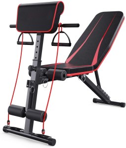 - 【Sept Positions ajustables】Banc plat & incliné a 7 positions, on peut l’ajuster comme banc de sit-up,ainsi que les exercices d’haltères. Un ensemble supplémentaire de cordage élastique de résistance peut aider à stimuler votre entraînement de musculation sans haltère.